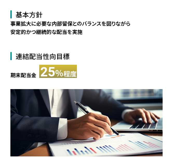 2024年10月期は2026年10月期のゴールに向けて、売上高及び営業利益の達成へ向けて着実な業績向上に取り組んでいく決意です。堅実な成長にともなう期末配当はすでに増配を発表していますが、今後も連結配当性向の目途を25%として、当期純利益を踏まえた配当を実施してまいります。