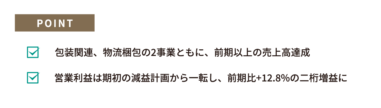 物流梱包事業においても、脱プラや紙資材への関心の高まりから新規引き合い、新規契約は増加中です。引き続き、顧客ニーズに訴求した営業力を強化するとともに、拡販に努めてまいります。