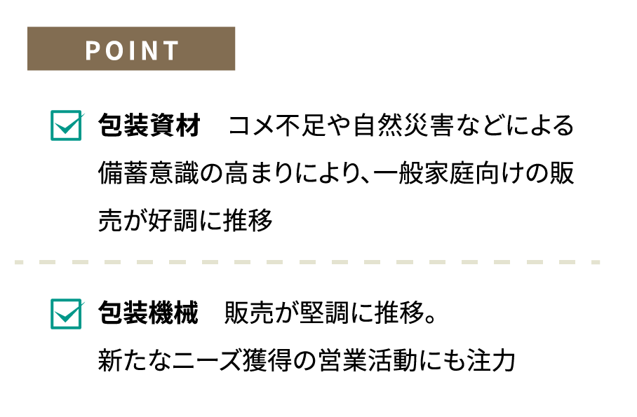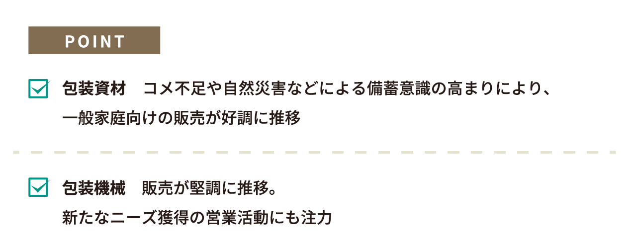 包装関連事業では、「令和のコメ騒動」の影響により、包装資材の受注がリピートオーダーを中心として好調に推移しました。「令和のコメ騒動」は、令和5年産米の不作や、昨年発生した能登半島をはじめとする各地の地震による社会不安の増大など、複合的な要因による備蓄ニーズの拡大が主な理由でした。当社の取扱商品においては、長期保存可能なチャック付き資材やバリアタイプ資材などの備蓄ニーズに対応した商品、その他、新規の4kg、2kgといった小分け用包装資材の販売が売上高に寄与いたしました。