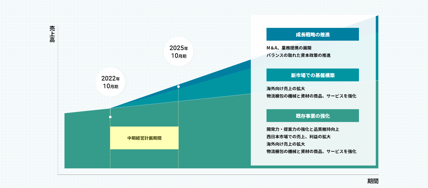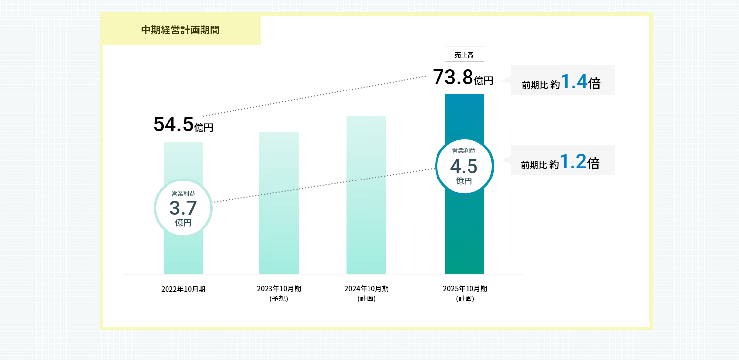 事業規模拡大を目論み、2022年12月に中期経営計画を発表いたしました。本中計では、既存事業の強化・拡充・シェア拡大と新領域の開拓を骨子としております。具体的には、西日本市場と東南アジアを中心とした海外向け市場における既存事業の拡大、米穀以外の新市場への販売促進、M&Aや業務提携の推進により事業規模を拡大していきます。3年後となる2025年10月期の売上高は前期比約1.4倍の73億8,400万円、営業利益は前期比約1.2倍の4億5,800万円を見込んでおります。