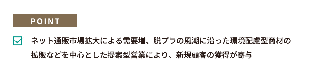 物流梱包事業においても、脱プラや紙資材への関心の高まりから新規引き合い、新規契約は増加中です。引き続き、顧客ニーズに訴求した営業力を強化するとともに、拡販に努めてまいります。